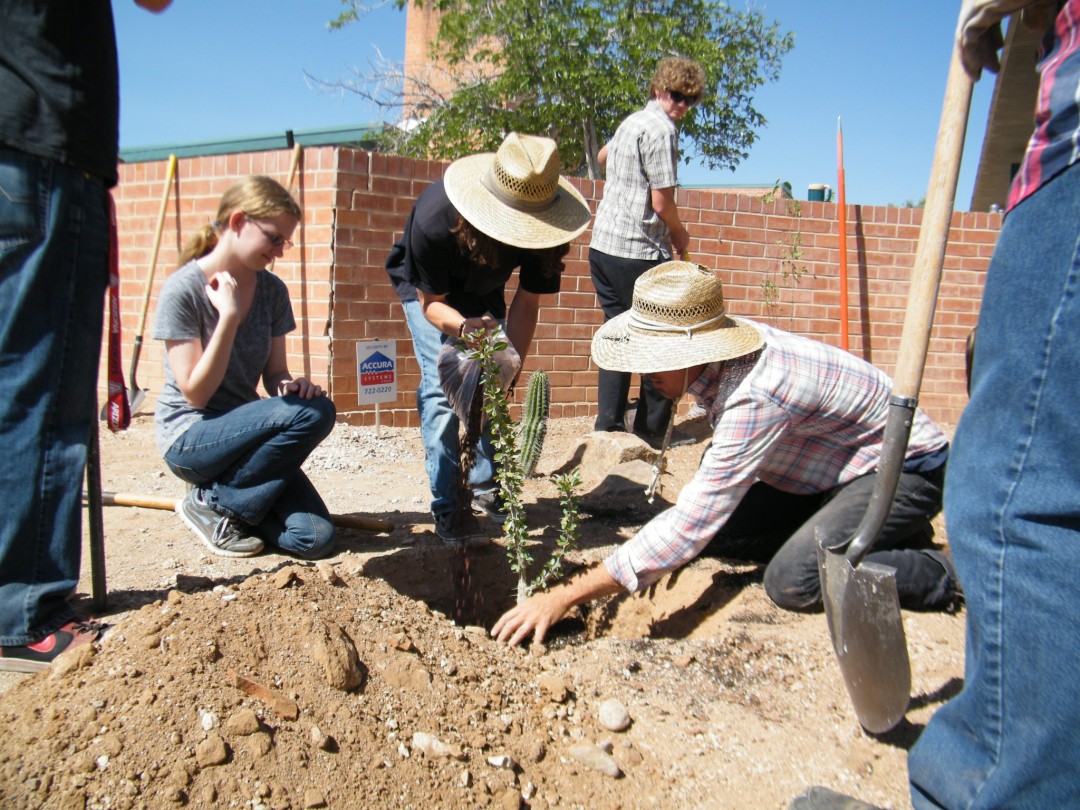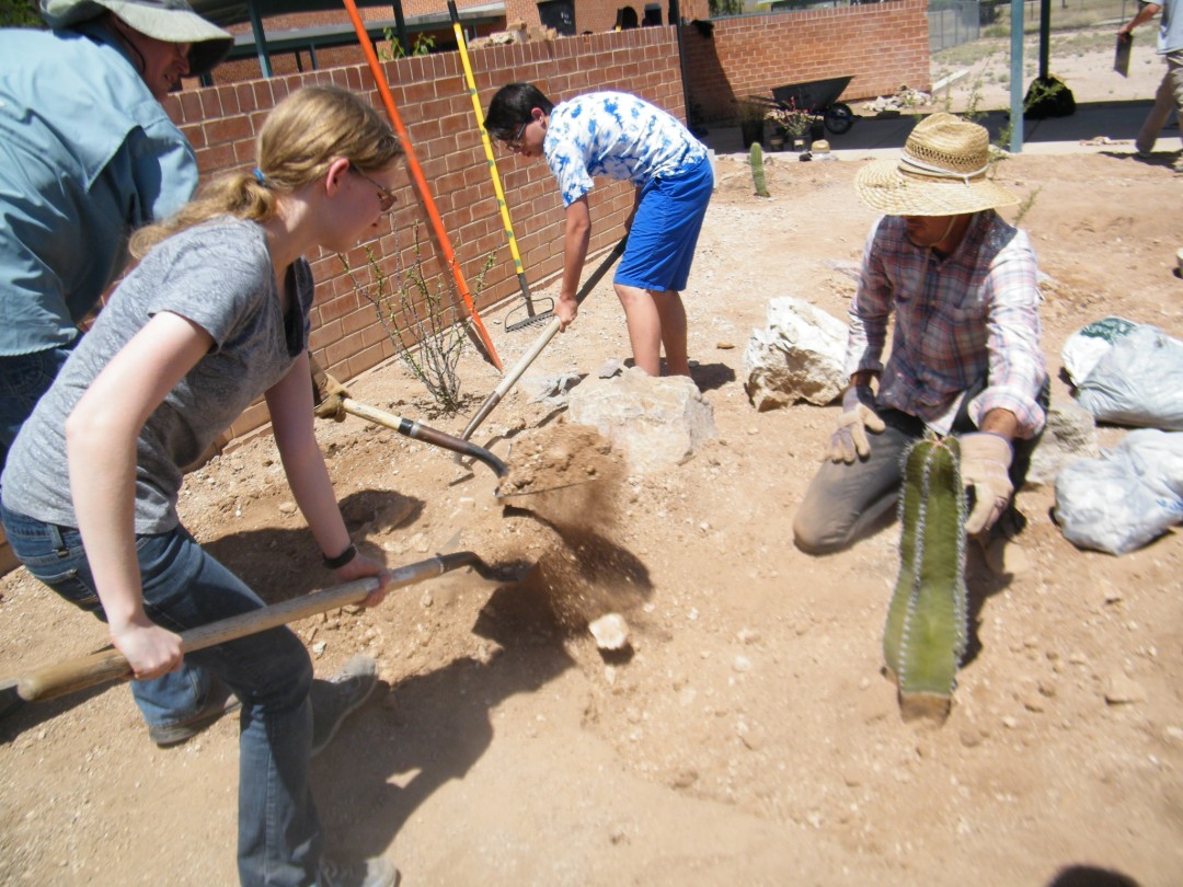As part of the continuing revitalization and restoration of the Rogers Commons, students in the Gardening by Design and Intermediate Permaculture class created a cactus and succulent garden that is a showpiece of many rare or important indicator species of succulent plants endemic to the Sonoran Desert region. The garden was made possible by a generous grant from the Tucson Cactus and Succulent Society, and features species from all the major bioregions of the Sonoran Desert, as well as some native trees and grasses as accents. The garden is not only a beautiful design that reflects the principles of xeriscaping, permaculture, and Japanese design aesthetic, but it also functions as an outdoor laboratory, science classroom, and a stunning showpiece of the plant biodiversity of the Sonoran Desert. As a grand finale, students planted an 8 foot saguaro rescued from a site at DMAFB.