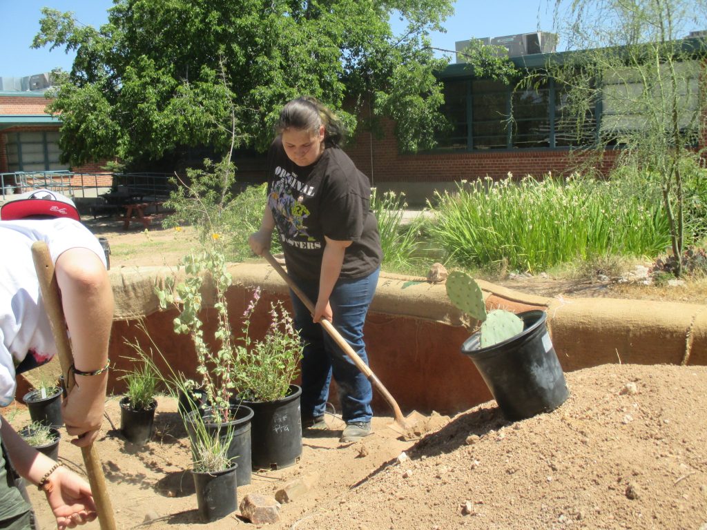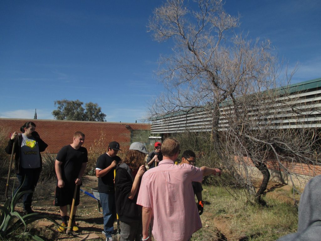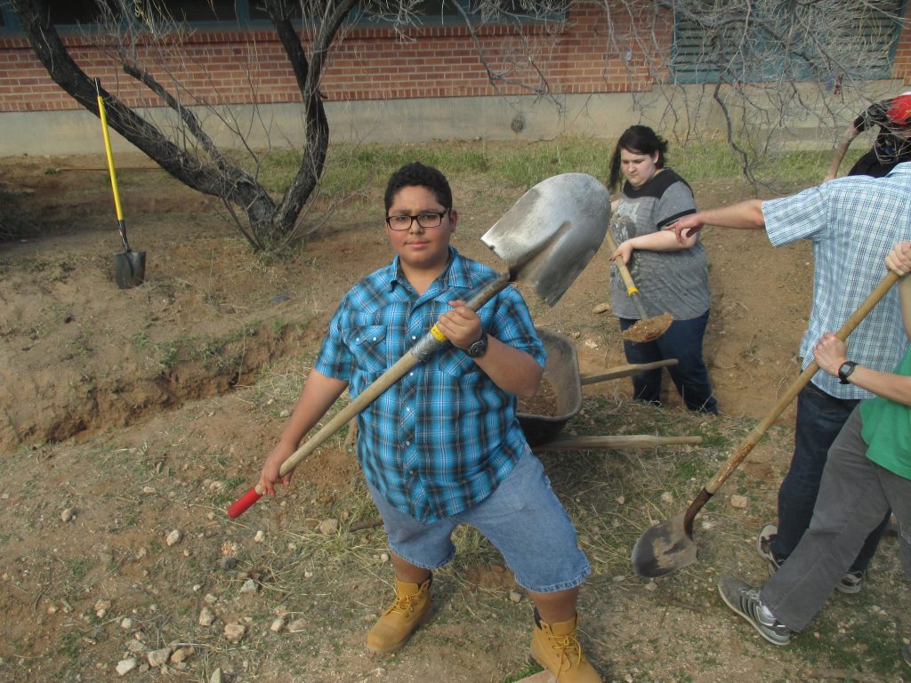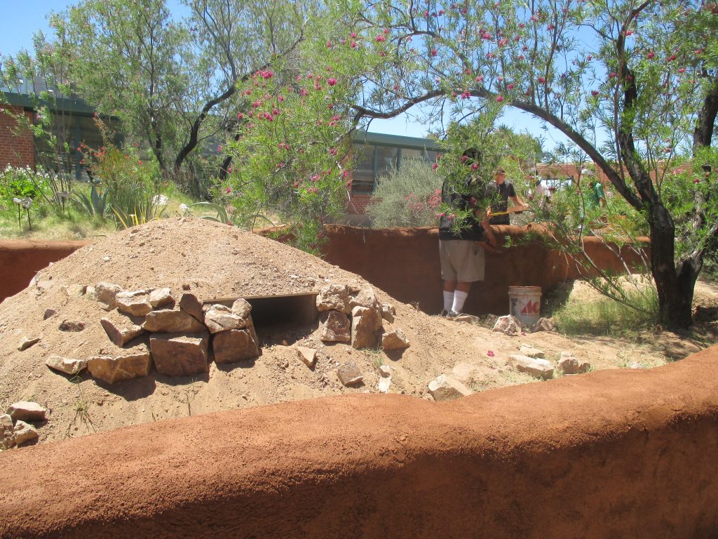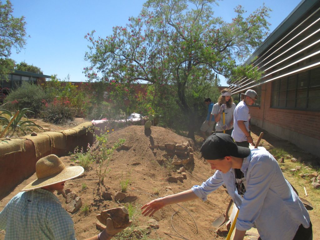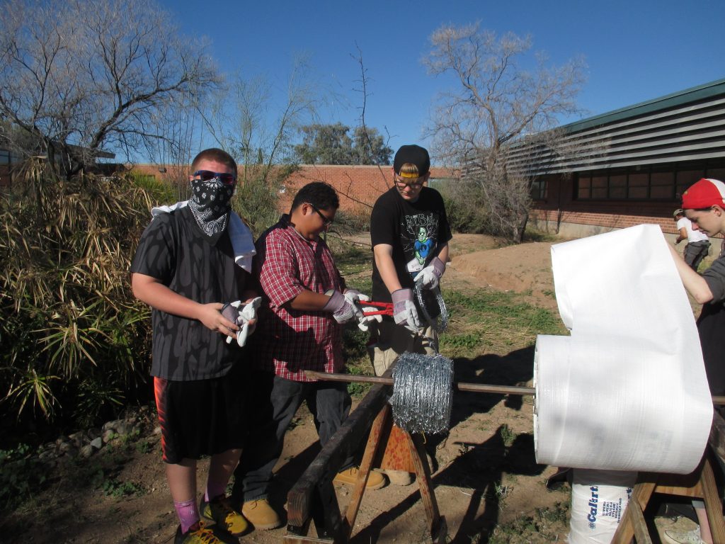Last year, students in the Projects, Research, and Design class wrote a grant to the AZ Game and Fish Dept. Heritage Fund to build a desert tortoise habitat in the school’s courtyard. They received the grant, but did not have enough time to actually begin construction. That was the job of this year’s Ecobiology students. After spending much time in the classroom learning about desert tortoise physiology, anatomy, behavior, adaptations and ecological relationships, as well as captive care, the students got to work on building the habitat.