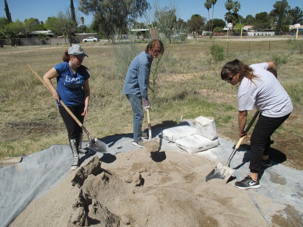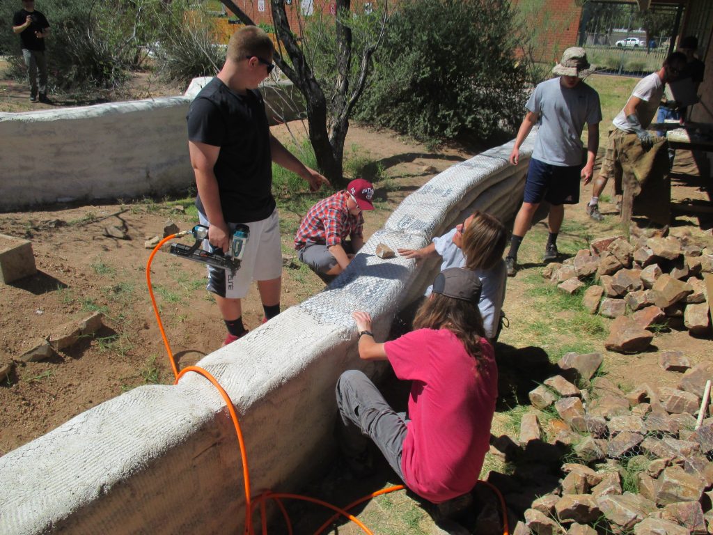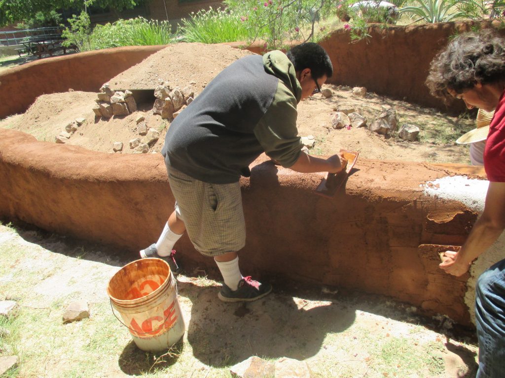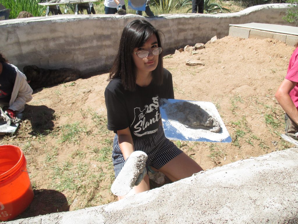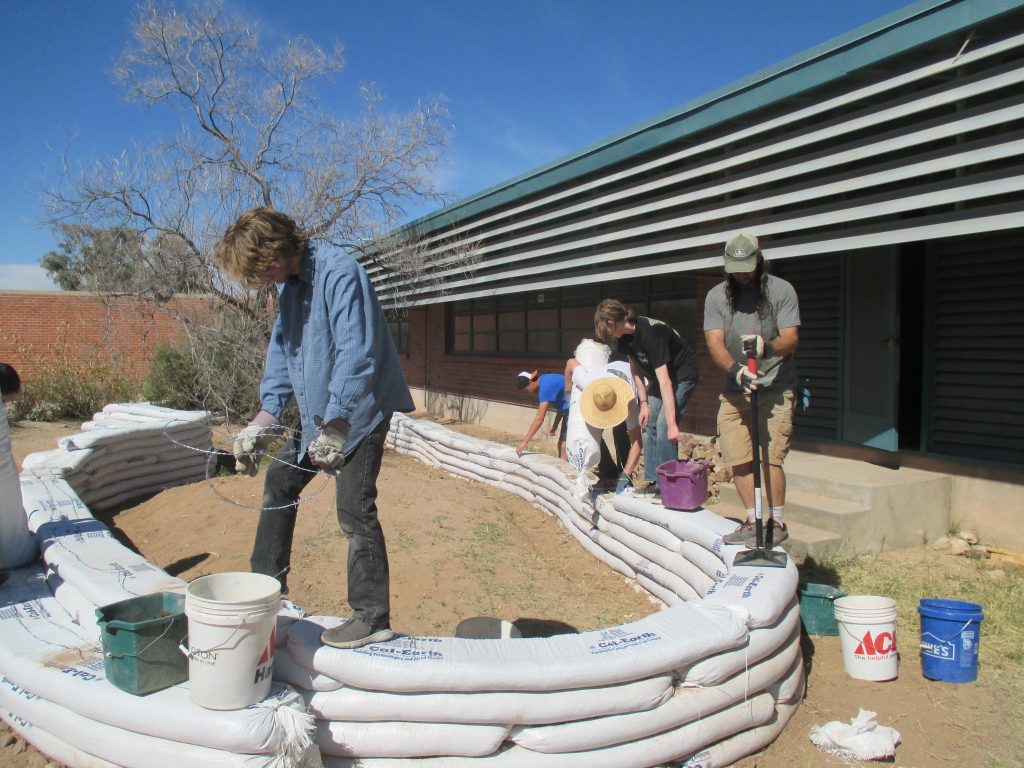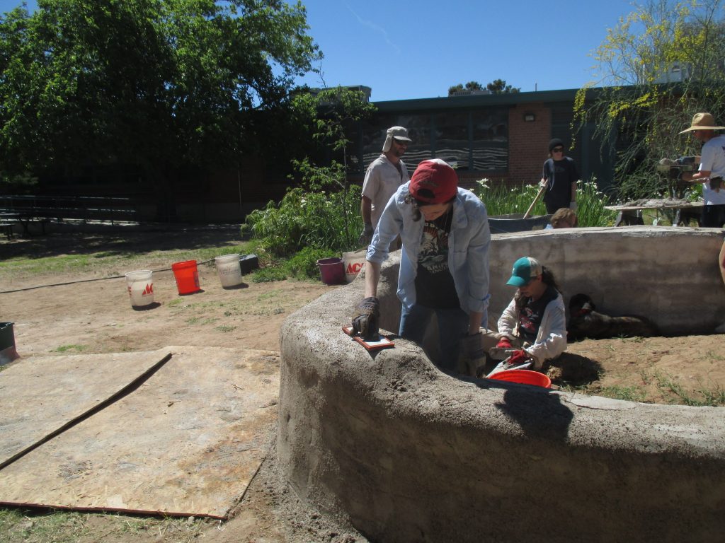 The enclosure was built with the help of master sustainable builder Bert Scott, along with much assistance from Sky Islands parent, neighbor, and eternal supporter Danny Clark. The walls were built using polypropylene bags filled with a mixture of soil and cement, which were then plastered using a hydraulic lime plaster. This type of plaster, which is much safe and environmentally friendly compared to standard lime plaster, was provided by Natasha Winnik at Originate Natural Building Materials. To complete this massive undertaking, several all-day Saturday workdays were required, where a massive outpouring of students, family, friends, and neighbors showed up to lend a hand and leave their mark on this incredible experience.