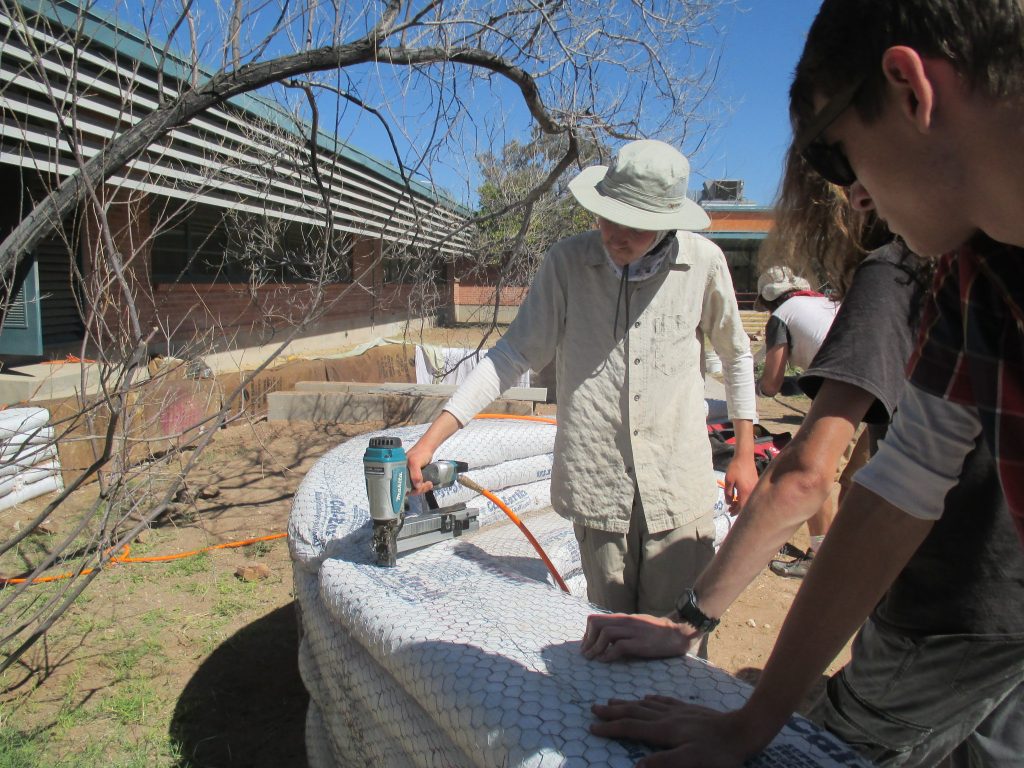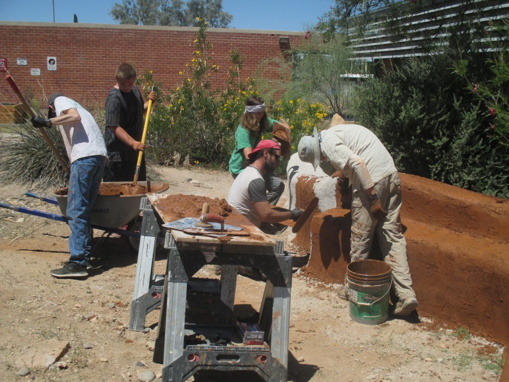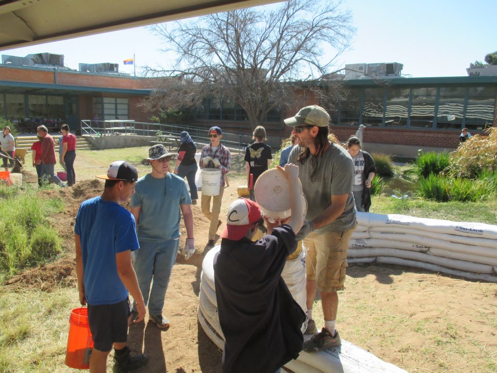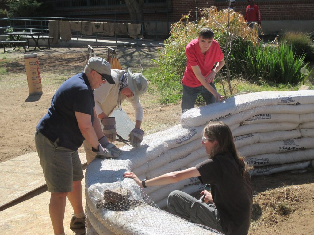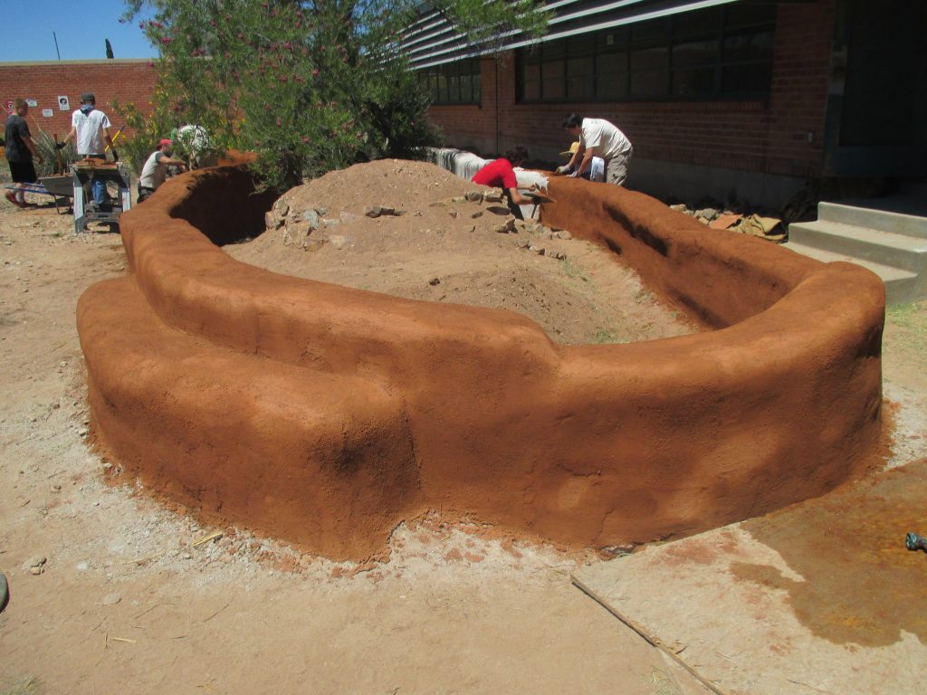 The enclosure was built with the help of master sustainable builder Bert Scott, along with much assistance from Sky Islands parent, neighbor, and eternal supporter Danny Clark. The walls were built using polypropylene bags filled with a mixture of soil and cement, which were then plastered using a hydraulic lime plaster. This type of plaster, which is much safe and environmentally friendly compared to standard lime plaster, was provided by Natasha Winnik at Originate Natural Building Materials. To complete this massive undertaking, several all-day Saturday workdays were required, where a massive outpouring of students, family, friends, and neighbors showed up to lend a hand and leave their mark on this incredible experience.