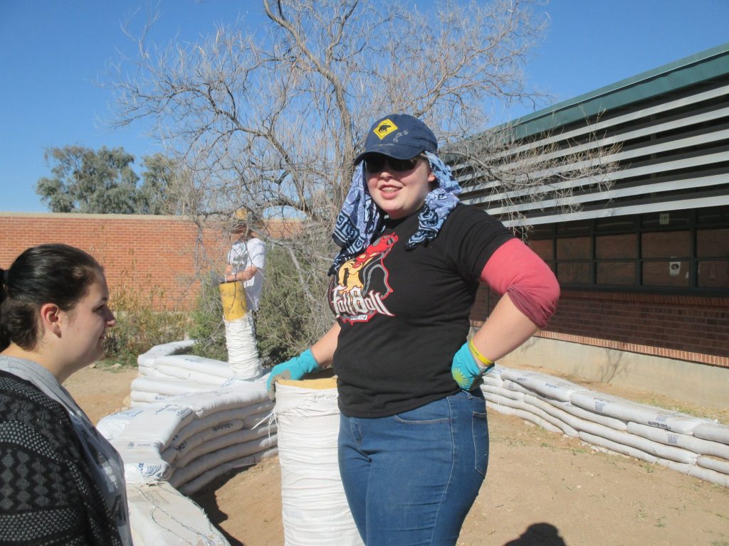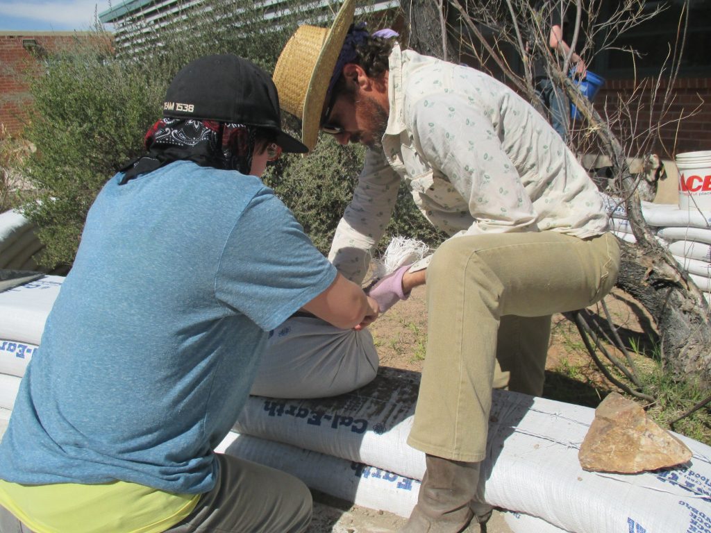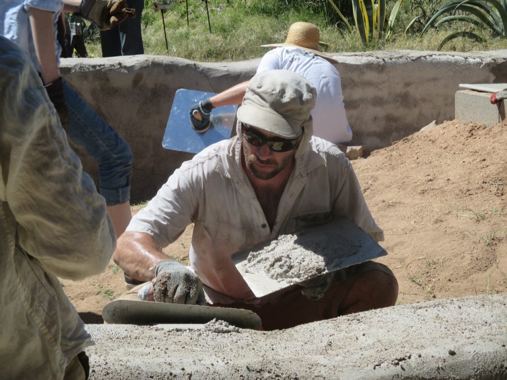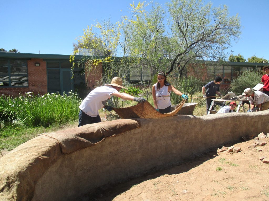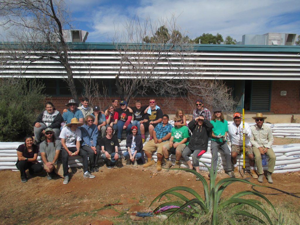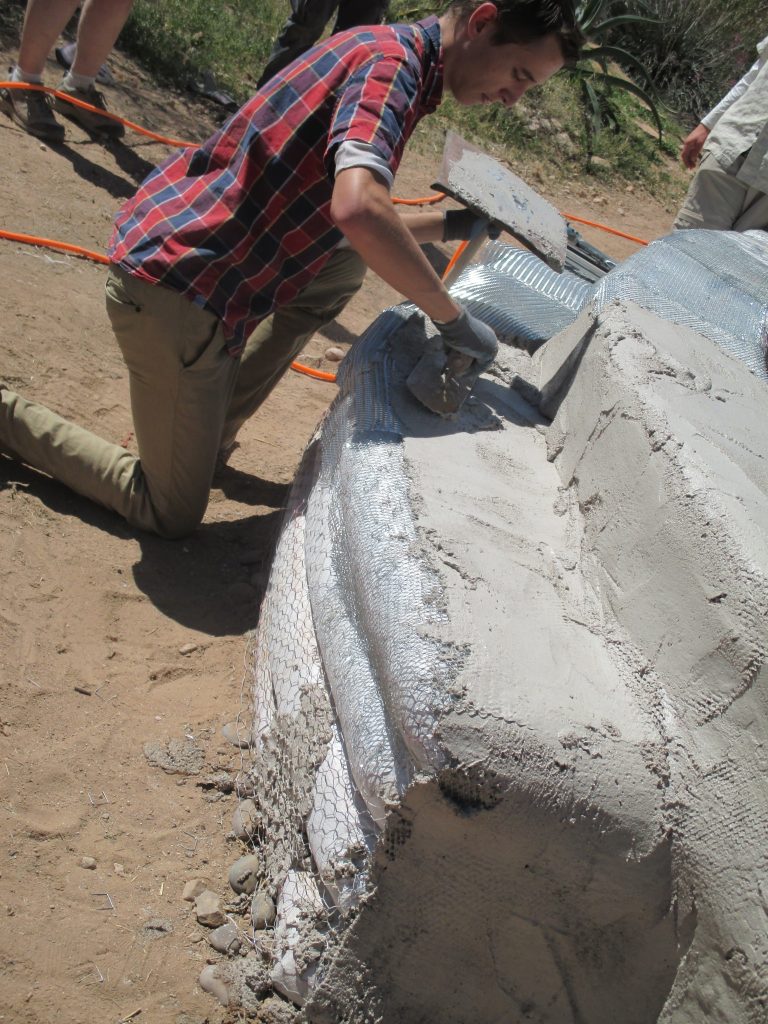 The enclosure was built with the help of master sustainable builder Bert Scott, along with much assistance from Sky Islands parent, neighbor, and eternal supporter Danny Clark. The walls were built using polypropylene bags filled with a mixture of soil and cement, which were then plastered using a hydraulic lime plaster. This type of plaster, which is much safe and environmentally friendly compared to standard lime plaster, was provided by Natasha Winnik at Originate Natural Building Materials. To complete this massive undertaking, several all-day Saturday workdays were required, where a massive outpouring of students, family, friends, and neighbors showed up to lend a hand and leave their mark on this incredible experience.