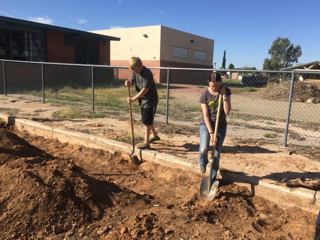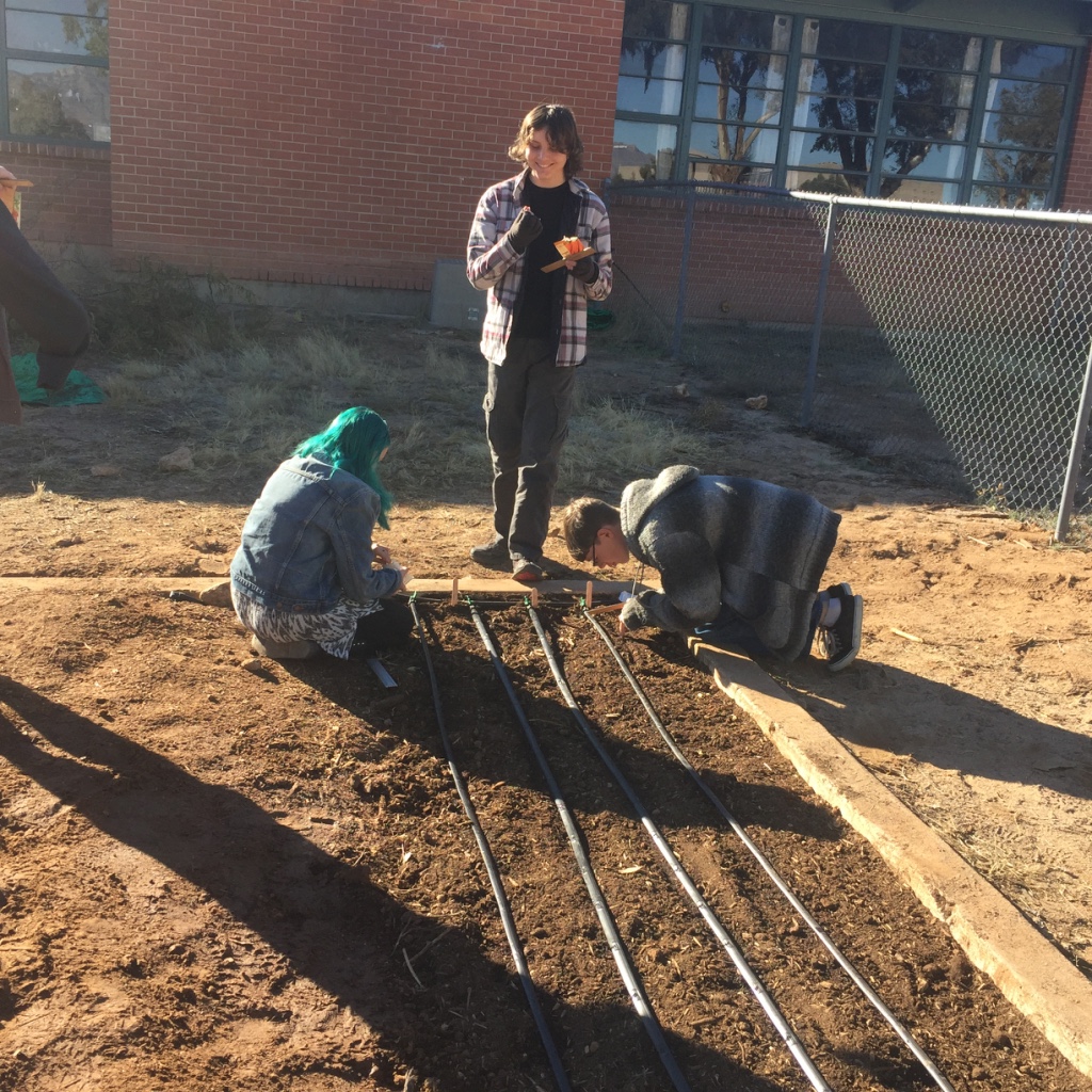 Students in the LA 9/ Strategic Reading class have been reading about soil ecology and the biology of a garden in preparation for the construction of the school’s Kitchen Garden, which is the class project. However, before the students started on the creation of the garden, they had to test our soil structure, texture, and overall health. Then, they compiled all of their results into a soil report. Next, they prepared the soil by double digging-a technique that requires digging down two feet before adding any compost and soil amendments. Double digging aerates the soil and allows easier root penetration once seeds are planted. Once that was completed, the students backfilled the trench with compost, then installed the irrigation system. Following a ribbon-cutting ceremony, the first row of the Kitchen Garden was planted!