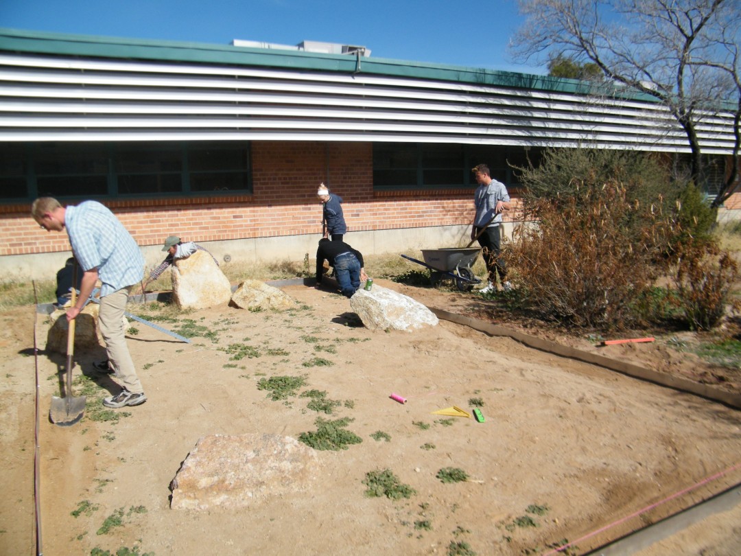 Students in the Projects, Research and Design class finished the job they started last year in the Gardening by Design class by transforming the rocks they set in the courtyard into a beautiful and serene Japanese-style rock garden! The garden, generously funded by a student-driven GoFundMe campaign, was created using the principles of Japanese design and rock setting, but with all local plants and materials, giving it a local feel. The rocks are set in a symbolic way to represent the four Sky Islands mountain ranges that encircle the Tucson Basin, and the trees are Palo Verde and heritage San Rafael Plums, which mimic the traditional ume and sakura trees in Japanese gardens. This project brought the courtyard one step further to completion and is part of the larger transformation of the school’s site into the thriving, beautiful Rogers Commons.